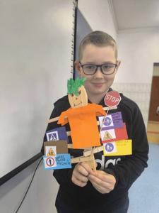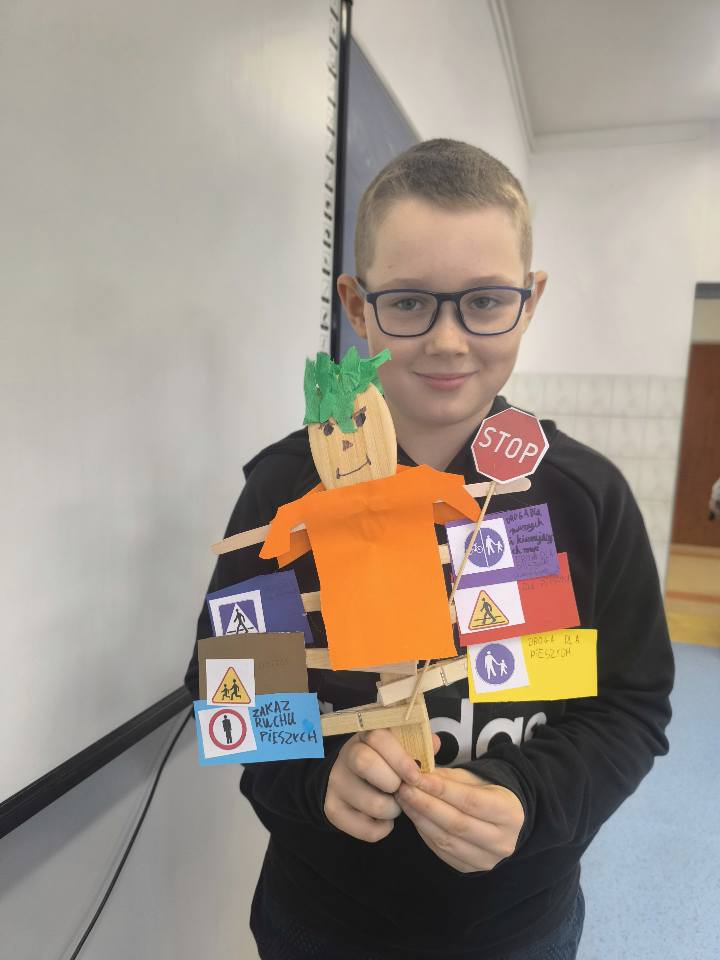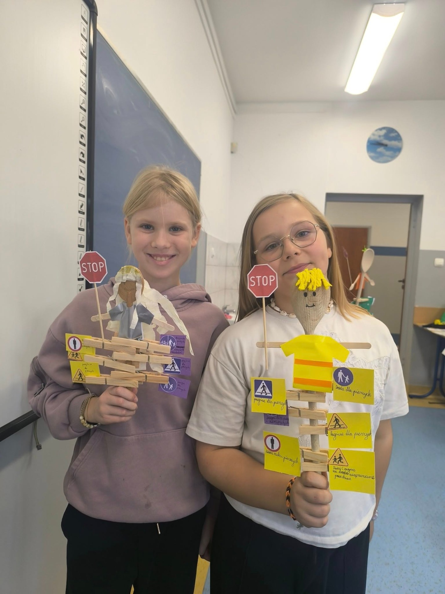 Uczniowie klas 4 podczas lekcji techniki wcielili się w projektantów bezpieczeństwa i wykonali swoje prace techniczne – Pana i Panią Stop. Każda postać została wyposażona w odblaskową kamizelkę, bo nasi młodzi twórcy doskonale wiedzą, jak ważne jest, aby być widocznym na drodze! Na swoich pracach uczniowie umieścili również ważne znaki drogowe dla pieszych, dzięki czemu utrwalili ich znaczenie i przypomnieli sobie zasady bezpiecznego poruszania się po drodze. To kolejne działanie w ramach akcji „Odblaskowa szkoła”, która przypomina, że odblaski mogą uratować życie.