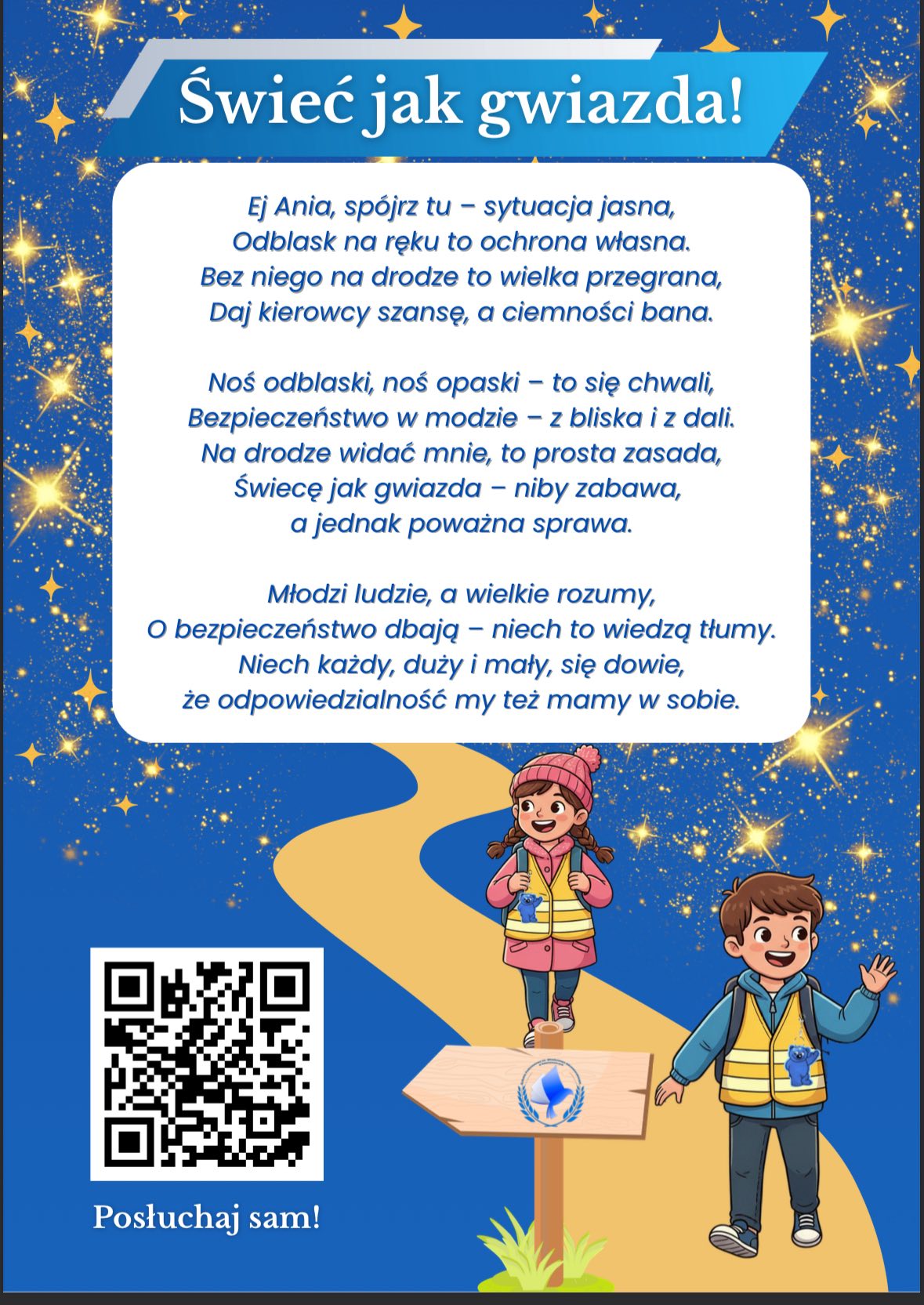 W naszej szkole odbyły się wyjątkowe warsztaty językowe, których punktem wyjściowym była autorska piosenka o bezpieczeństwie na drodze. Dzieciaki egzamin z jej interpretacji, poczucia rytmu, zdały celująco. Tekst, całkowicie oryginalny i napisany specjalnie dla naszych uczniów, stał się inspiracją do rozmów, twórczych zadań i ćwiczeń językowych. Zajęciom towarzyszył także plakat promujący bezpieczeństwo, przygotowany przez Panią Kasię Bocianowską-Badowską. Plakat został wzbogacony o kod QR, który po zeskanowaniu umożliwia odsłuchanie oryginalnej ścieżki dźwiękowej. Dzięki temu mieszkańcy Radziejowic i okolic mogą nie tylko przeczytać tekst, ale również go usłyszeć. Jeden z plakatów trafił do Urzędu Gminy Radziejowice, aby szerzej promować ideę bezpieczeństwa i przypominać wszystkim, że noszenie odblasków może uratować życie. Wszystkie działania zostały zrealizowane w ramach udziału naszej szkoły w konkursie „Odblaskowa Szkoła”, który ma na celu kształtowanie wśród dzieci i młodzieży odpowiedzialnych postaw oraz budowanie świadomości dotyczącej bezpieczeństwa na drodze.