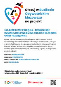25 lipca 2025 r. rozpoczęło się głosowanie online na projekt zgłoszony przez mieszkańców Gminy Radziejowice w ramach Budżetu Obywatelskiego Mazowsza. Inicjatywa zakłada montaż nowoczesnego oświetlenia LED na siedmiu przejściach dla pieszych zlokalizowanych w ciągu drogi wojewódzkiej nr 579.
